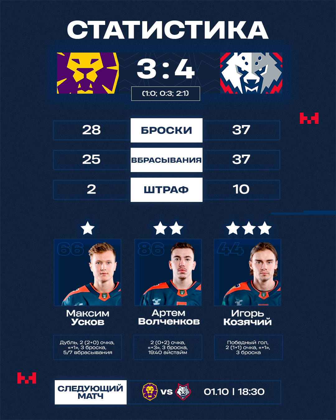 – В первую очередь спасибо нашим болельщикам за поддержку. Приехали, вдохновили нас – молодцы! Матч можно разложить на две части. Первый и второй периоды – хорошая игра, работа, большое преимущество имели по моментам, игровое. Должны были больше трех шайб забрасывать. И отдельно третий период, где допустили ошибки, о которых мы говорили, и удаления нашу игру подломали. Соперник почувствовал кровь, пошел вперед. Выстояли, отбились в меньшинстве, все равно победили.