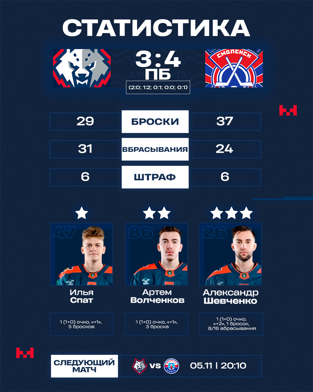 Третий подряд матч со «Славутичем» в сезоне-2025/26 завершился за пределами основного времени – и вновь победой смолян. При этом «волки» по ходу встречи вели со счетом 3:0. В первом периоде к голам привели контратака, которую завершил точным броском Шевченко, и подключение вперед Волченкова – защитник забросил дебютную шайбу в сезоне.