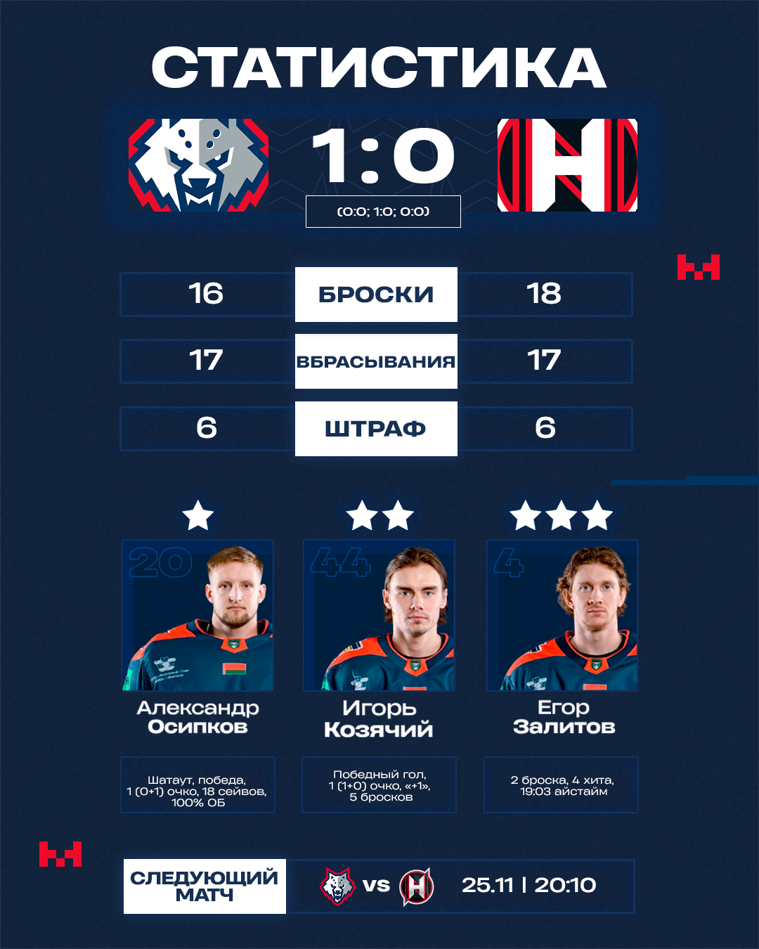 Второй матч «волков» подряд завершился сухой минимальной победой. Причем решающий гол вновь забил Игорь Козячий, который стал автором единственной шайбы и во встрече с «Гомелем». Поменялся только герой в рамке: первый шатаут в текущем сезоне оформил Александр Осипков, справившийся с 18 бросками гродненцев.