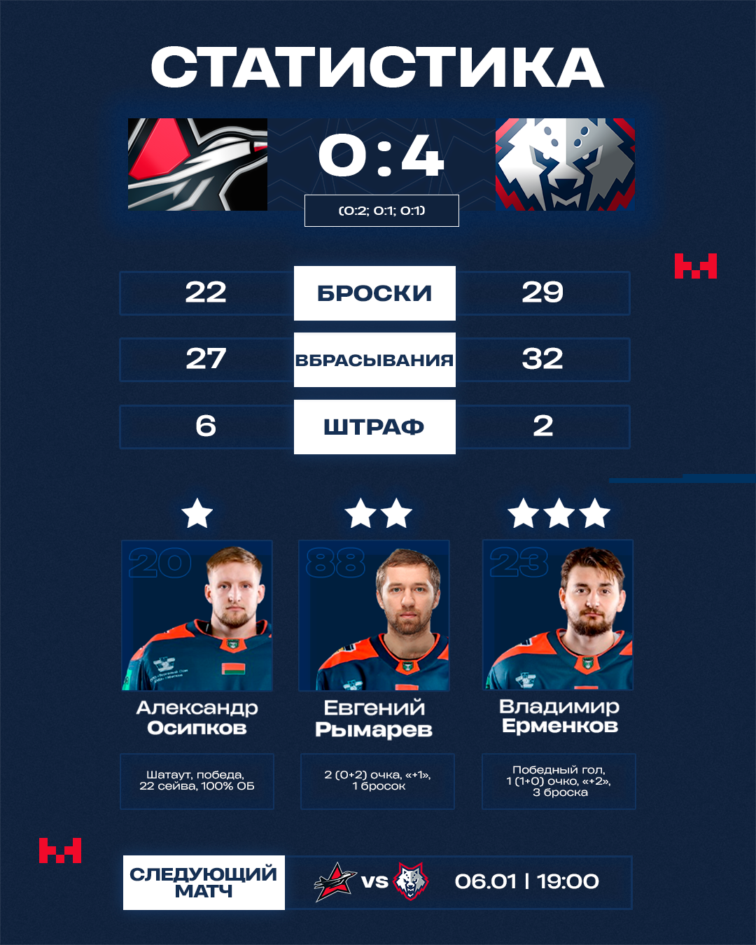 Лучше со своей справились «волки», удержав ноль в графе пропущенных шайб. Солидная концовка помогла Осипкову сделать второй шатаут в сезоне, а команде уверенно начать 2026 год.