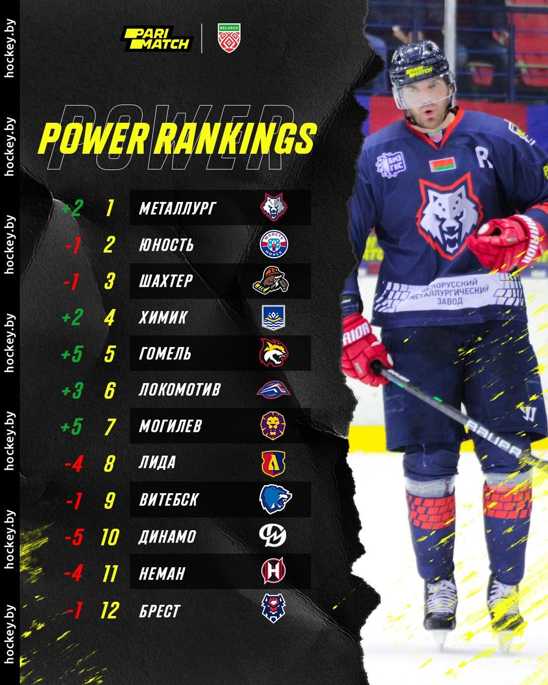 «Металлург» обогнал конкурентов и в «Индексе силы» команд экстралиги. Рейтинг строится на основании показателей команд на определенном отрезке сезона – в данном случае, недели. Индекс показывает, какой из участников является самым «горячим». Формула расчета довольно проста: победитель «отбирает» у соперника 25 процентов очков в случае победы в основное время и 12.5 процентов, если обыгрывает его в дополнительное. Поэтому команды, которым удается одолеть лидеров, двигаются в рейтинге существеннее. Перед началом недели «волки» занимали третью позицию в «Индексе силы», но за счет побед над «Юность» и «Шахтером» стали первыми.